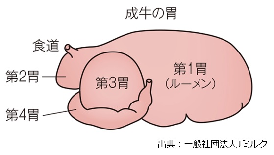 牛には胃が4つあって、食べた草はまず「ルーメン」と呼ばれる一番大きな胃に入ります。この中にはたくさんの微生物(びせいぶつ)が暮らしていて、食べた草の繊維質(せんいしつ)を微生物の力を借りて分解してもらっています。牛は微生物が草を分解しやすいように、一度飲み込んだ草を口の中にはき戻し、細かくすり潰してはまた飲みこむ「反芻(はんすう)」を繰り返します。