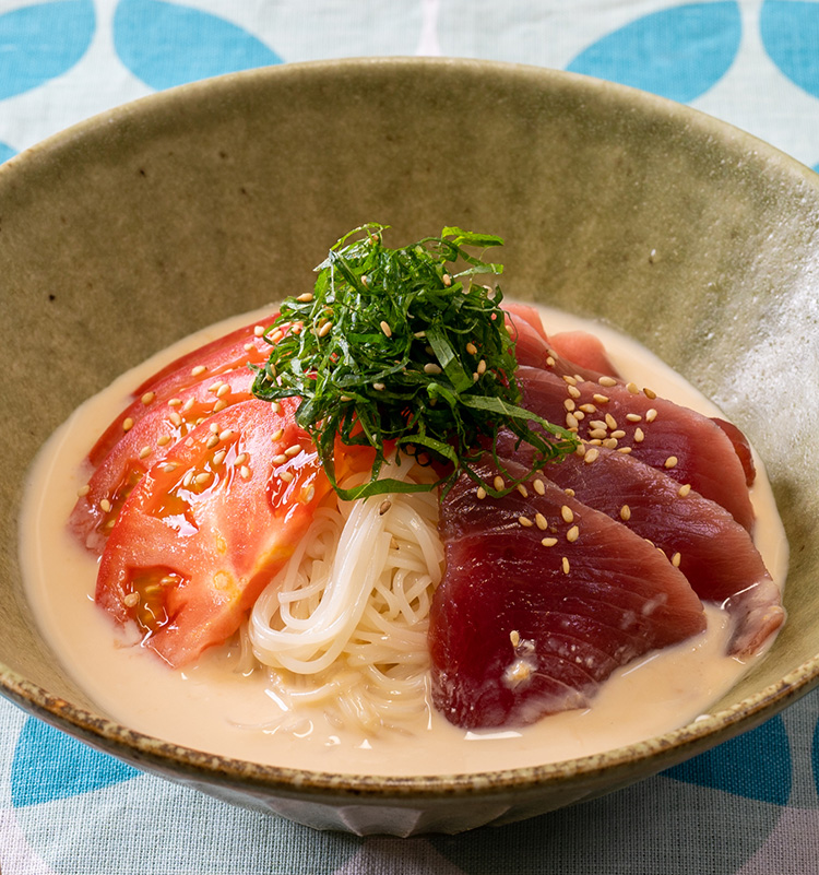 さっぱりとしたヨーグルトごまだれでいただく、夏にぴったりのそうめんメニュー。かつおとトマトの旨み、大葉の香りがアクセントです。ヘルシーで腸活にもオススメです。